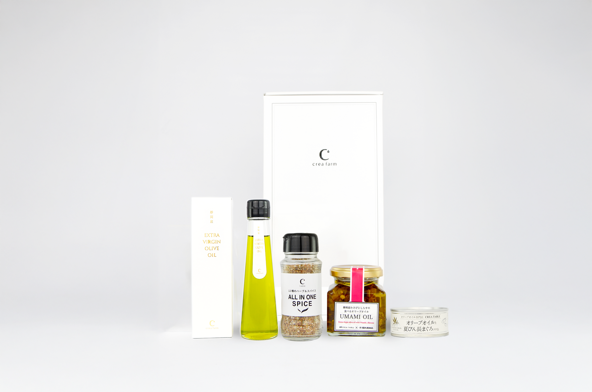 田丸屋様とのコラボ商品「静岡産わさびとしらすの食べるオリーブオイル」と、コールドプレス製法で搾油したプレミアムなエキストラバージンオリーブオイル、万能スパイスの「ALL IN ONE SPICE」のギフトセット。
