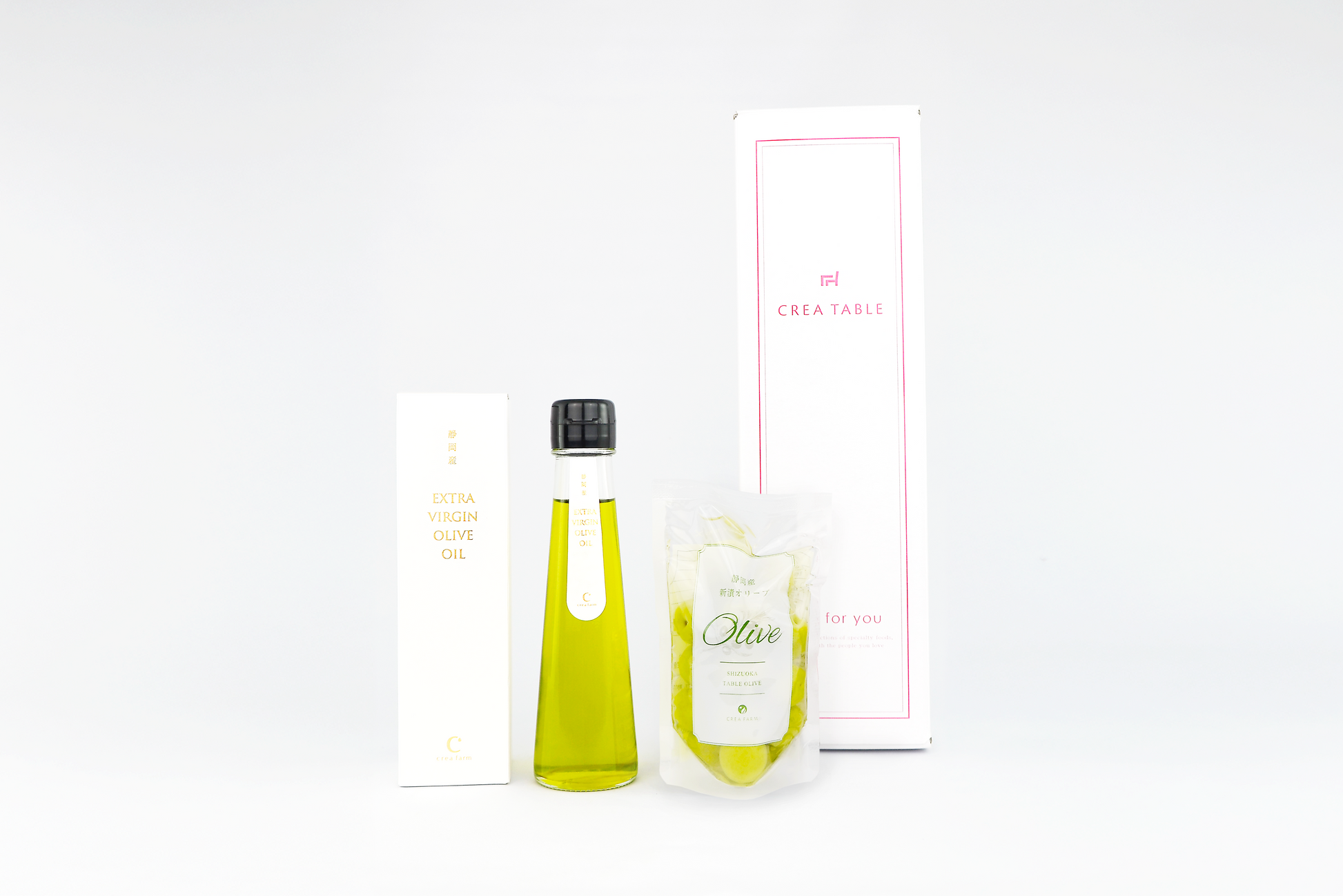 クレアファーム農園で収穫したオリーブ実を使用したオリーブ漬けと、コールドプレス製法で搾油したプレミアムなエキストラバージンオリーブオイルのギフトセット。