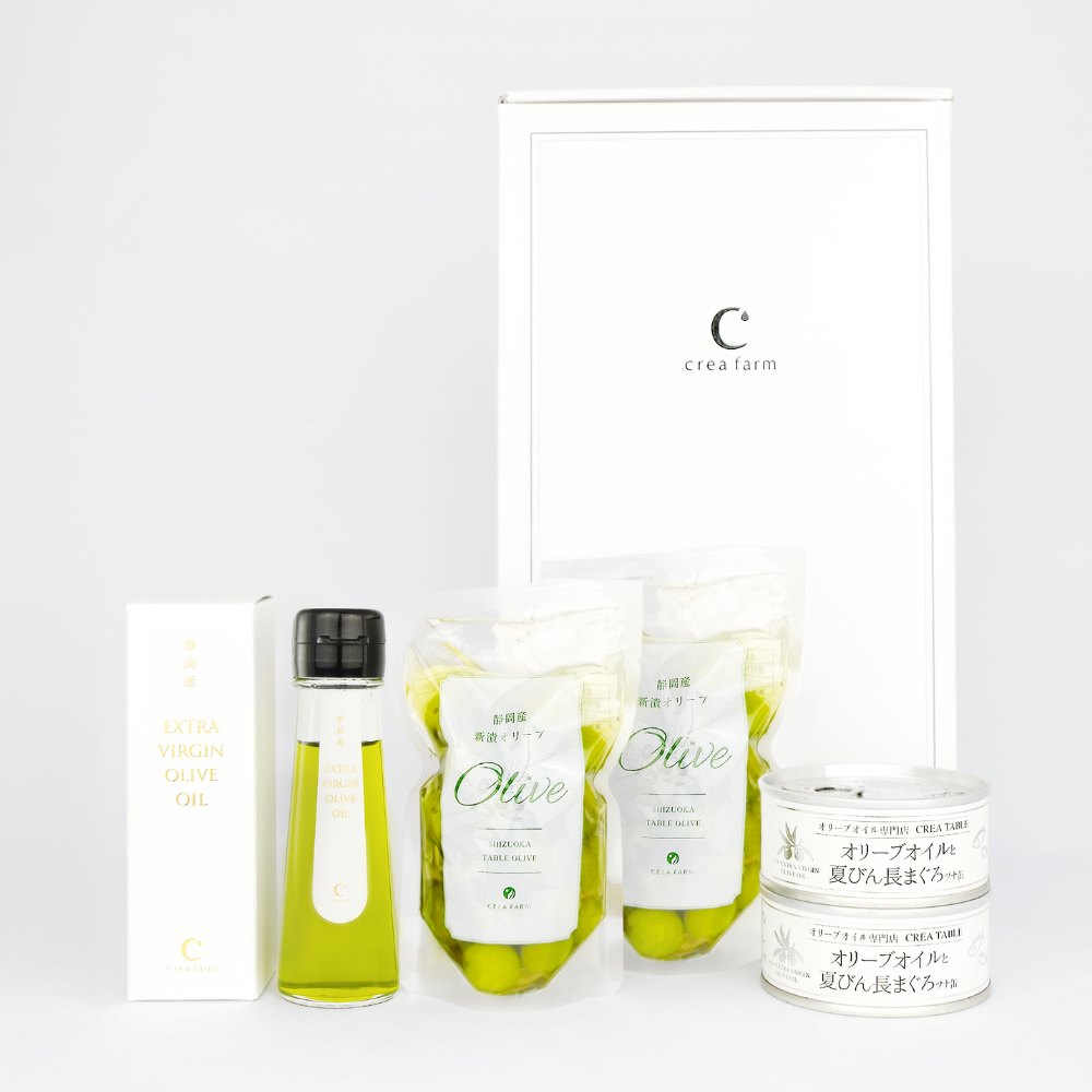 crea farm の自社オリーブ畑からお届けするプレミアムなギフトです。自社オリーブ園で栽培したオリーブから作ったエキストラバージンオリーブオイル、あっさり塩味に漬けた2種類のオリーブ漬け、オリーブオイルに漬けたツナをどうぞお楽しみください。